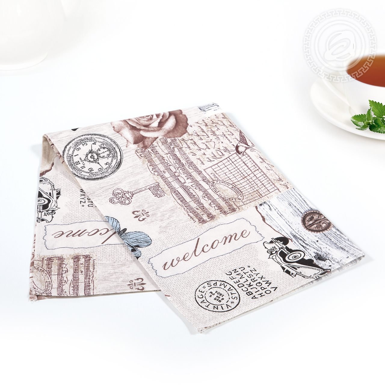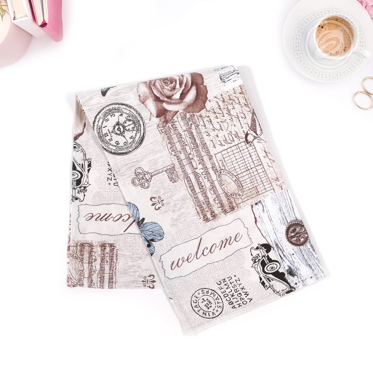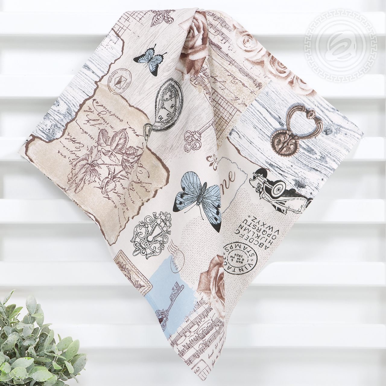 Описание: Полотенце с рисунком под названием «Либретто» будет украшением для любой кухни. Обилие различных изображений не является перегружающим, композиция состоит будто из пазла, соединяя воедино различные кусочки картин. Предметы старины, такие как: деревянные двери с ручками, часы, письма, создают свою атмосферу. А цветы и бабочки служат уместным дополнением. Практически все детали окрашены в бледный розовый цвет, но есть и нежно голубые элементы. Такое кухонное полотенце подойдет и в качестве подарка за счет своего качества и необычного рисунка.