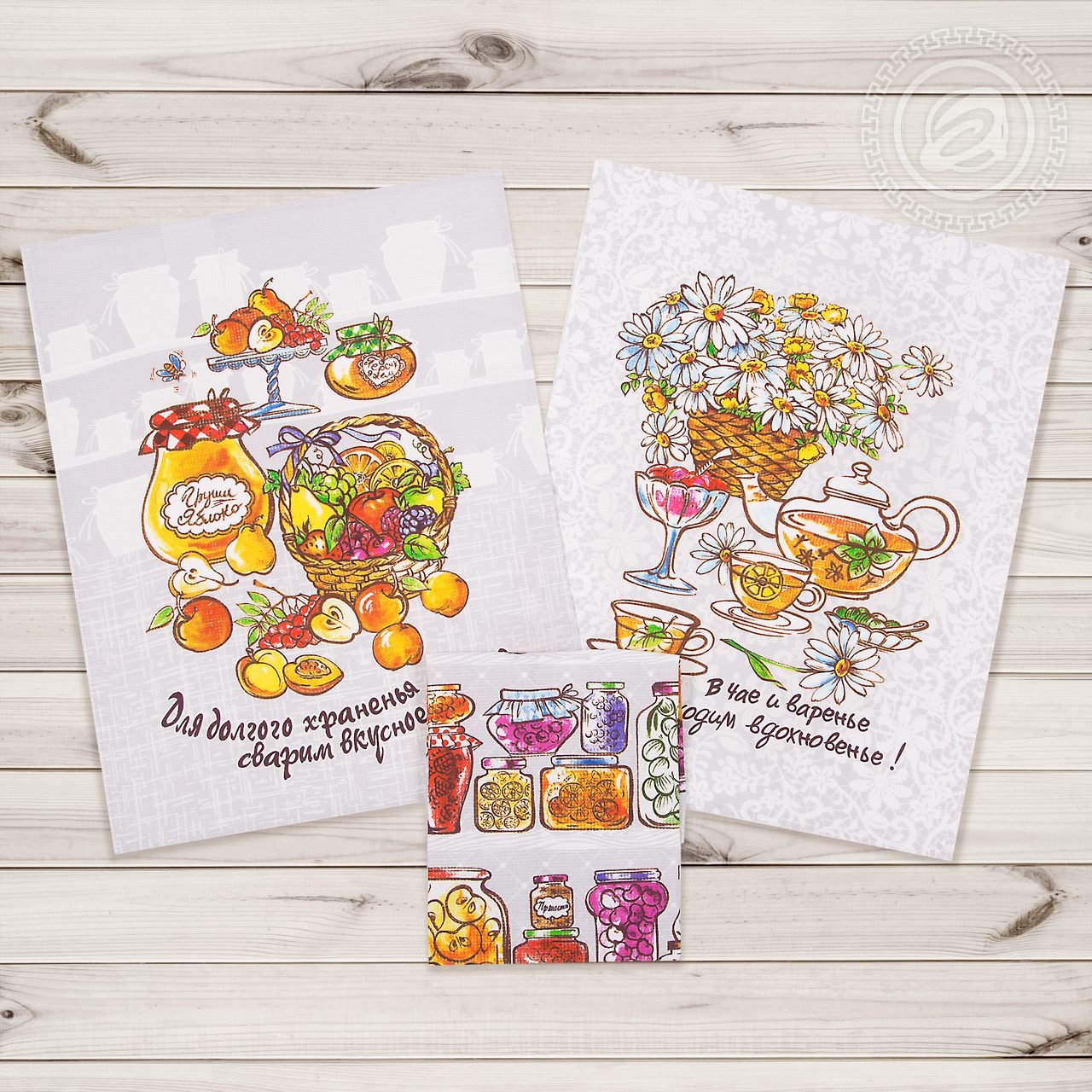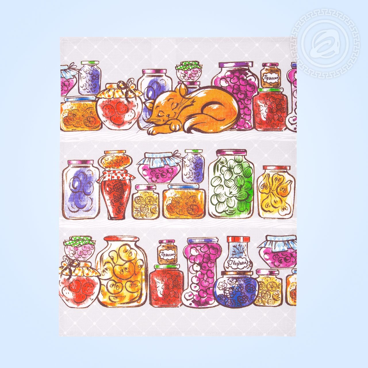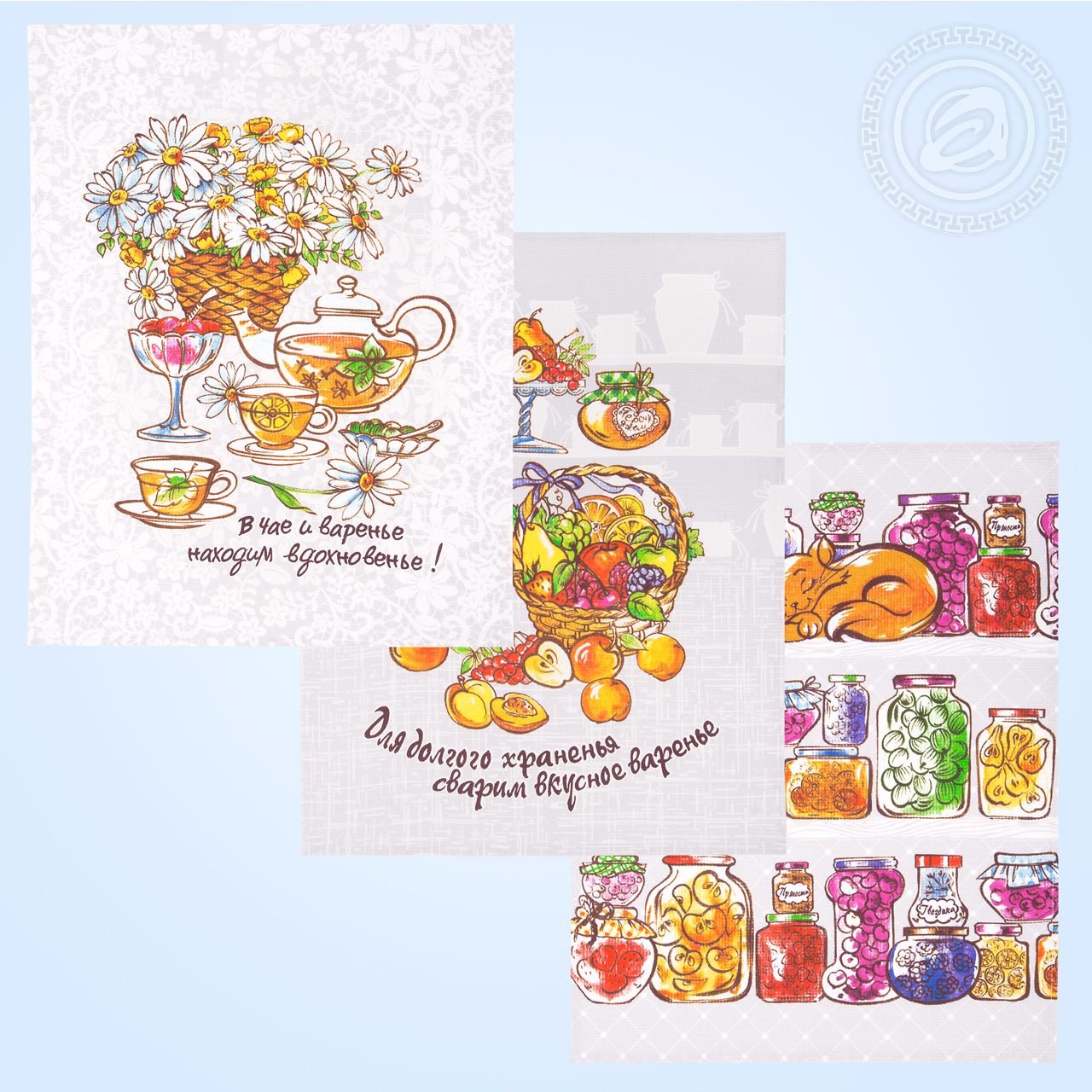 Описание: Комплект кухонных полотенец с рисунком под названием «Джем», пожалуй, чуть ли не самый лучший вариант для украшения стола. Три различных изображения, на каждом из которых присутствует баночка (а может и не одна) вкусного угощения. Дополнительные детали, такие как мирно сопящий котик, букет цветов или чайник с чашками, делают рисунок законченным и очень приятным. Вафельные полотенца – особо желательны на кухне, а с таким рисунком еще и украсят помещение, и порадуют своей красотой и качеством гостей.